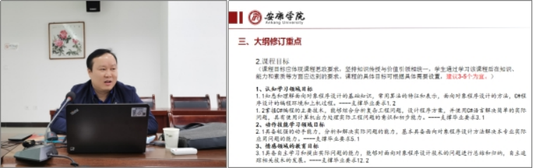 付争方从“以学生为中心”的OBE理念和工程教育认证的实质入手,讲解了基于OBE的2022版教学大纲修订目的、修订原则与框架、大纲修订重点三个方面。他强调,OBE是工程教育认证的核心理念之一,也是保障教育质量的底线要求;在人才培养方案及教学大纲修订前要明确毕业要求和培养目标的区别以及OBE理念下人才培养目标如何进行达成评价。随后他结合2022版教学大纲模板,给教师们展示了课程简介描述、基于OBE理念的课程目标设定、教学内容与课时学时分配、课程教学主要内容与教学要求、课程考核及成绩评定、实验(实训/实践)项目信息等大纲编写关键点。