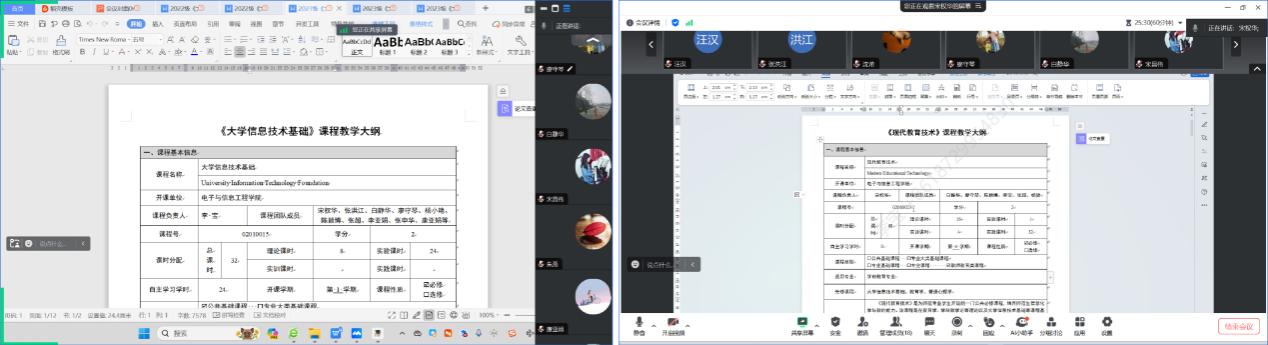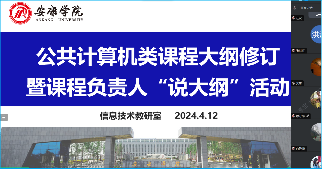 为迎接学校本科教育教学审核评估工作,深化课程改革,提高公共计算机类课程任课教师的教学水平和能力,结合学校要求及学院实际情况,信息技术教研室于2024年4月12日开展“公共计算机类课程教学大纲的修订暨课程负责人说大纲”的教研活动。此次活动采用腾讯会议线上形式举行,活动由李宝主持,电信学院教学副院长宋权华、信息技术教研室全体教师参加了本次活动。