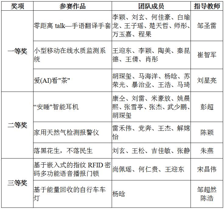 自2019年11月校赛启动以来,电信学院高度重视,统筹安排部署,及时组织学生报名参赛,动员教师加强指导,积极孵化培育项目。在疫情期间,创新工作思路,克服了疫情防控的重重困难,精心打磨,提升作品质量,项目《小型移动在线水质监测系统》、《爱(AI)看“茶”》、《手语翻译手套》在获得校赛一等奖后,推荐参加省级比赛获得了铜奖。