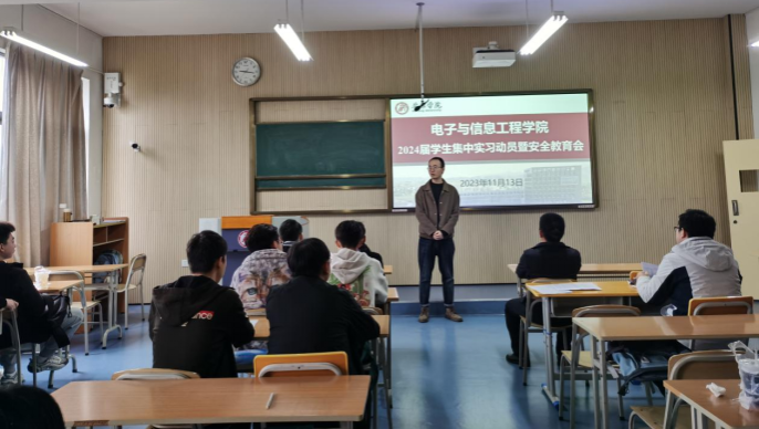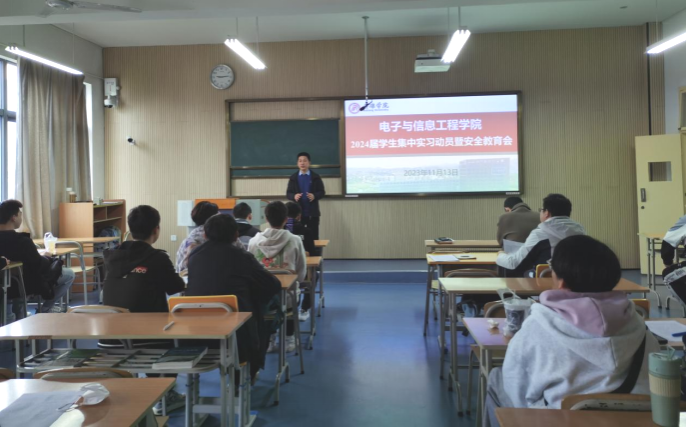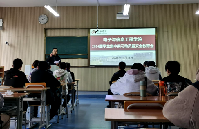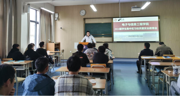 11月13日上午,电信学院1号教学楼1308教室召开了2024届毕业生集中实习动员暨安全教育培训会。会议由学院副院长宋权华主持,学院党总支副书记蔡正旺、实习班级辅导员张宇航、实习带队教师邬子逸以及参加本次集中实习的全体学生参加了会议。