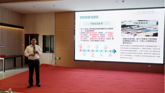 陈守满从学院概况、教学情况、科研实力、学生培养、学院文化、未来展望六个大的方面,就学院背景与定位、师资力量与教学资源、学科设置与特色、课程设置与教学方法、实践教学与校企合作、教学质量与成果、科研方向与成果、科研团队与平台、科研合作与交流、学生管理与服务、学生实践与就业、学院精神与价值观、学院活动与氛围、学院院训与办学理念、学院发展规划与目标、教育教学改革与创新、科研实力提升与拓展等具体内容进行了详细汇报与分享。陈守满表示,电信学院要发挥学科专业优势,构建创业型学院,着力打造人才培养和社会服务两张名片,为形成以秦巴生态数字赋能为特色的电子信息学科而努力奋斗。