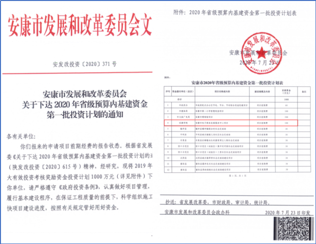 近月,安康市发展和改革委员会发布了《安康市发展和改革委员会关于下达2020年省级预算内基建资金第一批投资计划的通知》(安发改投资〔2020〕371号),电信学院组织申报的“安康市电子商务发展中心”平台项目成功获批,获得建设资金100万元。