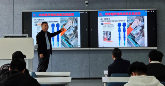 许龙教授结合自己的研究方向从超声技术的简介、功率超声振动系统的组成等方面做报告,介绍了各类超声振动系统的研究进展及其在超声清洗、超声加工、超声焊接、超声手术刀等方面的应用。报告会上,学院师生对报告中感兴趣的内容与专家进行了积极交流讨论。