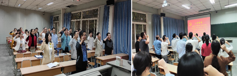 接下来,全体党员教师举行了“重温入党誓词”活动。在鲜红的党旗下,在党总支宣传委员宋权华同志的带领下,全体党员同志庄严地举起右手,握拳宣誓,重温入党誓词。