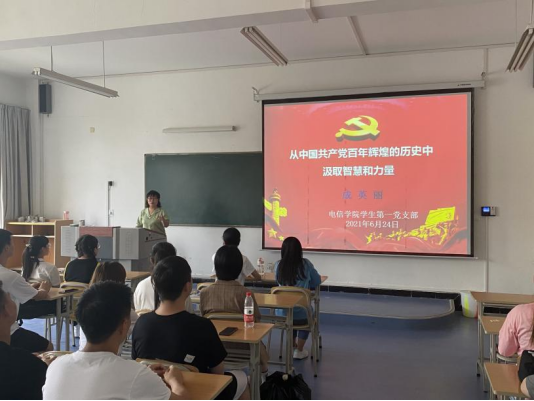 2021年6月24日下午在江北校区1321教室,电信学院学生第一党支部开展了支部书记讲党课活动,支部书记成英丽老师为全体学生党员讲了题为《从中国共产党百年辉煌的历史中汲取智慧和力量》的党课。此次党课主要包括三个方面内容:一是号召全体学生党员充分认识开展党史学习教育的重大意义;二是介绍开展党史学习教育的主要内容;三是鼓励全体学生党员从中国共产党辉煌历史中汲取继续进步的智慧和力量。