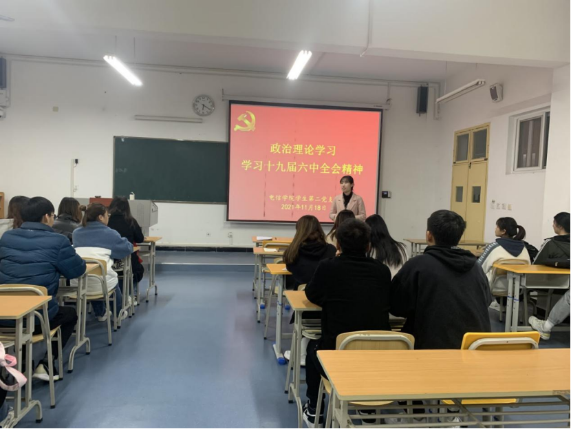 2021年11月18日下午,欧美日韩国产在线学生第二党支部在江北校区1321教室开展主题党日活动,就《习近平总书记在庆祝中国共产党成立一百周年大会上的讲话》和《中国共产党第十九届中央委员会第六次全体会议公报》进行专题学习,学生第二党支部支委、全体在校党员及发展对象参加了此次会议,会议由学生第二党支部书记李章雨主持。