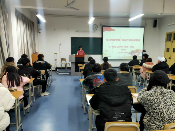 2021年12月9日下午在江北校区1321教室,电信学院学生第一党支部召开党员大会,党支部书记程晓梅讲授了主题为“学习贯彻党的十九届六中全会精神”的专题党课,党支部所属党员、发展对象和入党积极分子参加了党课学习。