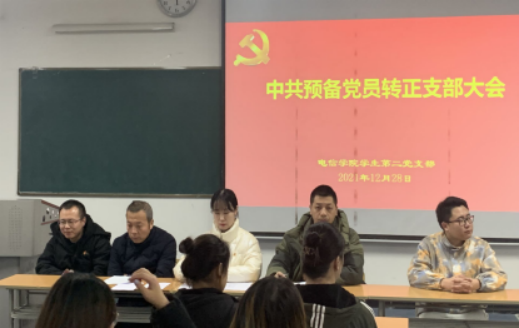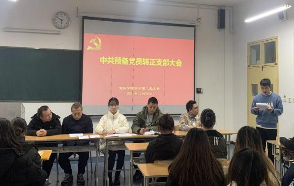2021年12月28日,电信学院学生第二党支部在教室1321召开党员大会,讨论中共预备党员转正。此次会议主要讨论了王迎东、周坤、董珂三位同志能否转为中共正式党员的事宜。组织(纪检)委员石纭昊、拟转正党员的培养老师,以及全体在校学生党员参加此次会议,大会由支部书记李章雨主持。