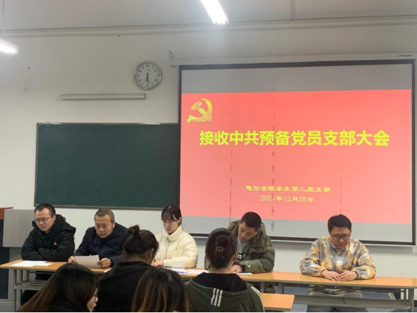 2021年12月28日,电信学院学生第二党支部于一号教学楼1321教室召开党员大会接收中共中央预备党员,讨论接收王嘉慧、王辉、陈昱江、田璐瑶、葛贝、程果六位同志加入中国共产党事宜。本次大会由电信学院学生第二党支部书记李章雨主持,组织(纪检)委员石纭昊,宣传(统战)委员蒋帅,入党介绍人崔智军老师、王泓淇老师,以及全体在校党员同志及本期发展对象参与此次议会。