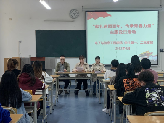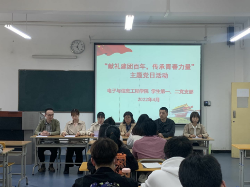 为庆祝中国共产主义青年团成立100周年,喜迎中国共产党第二十次全国代表大会即将召开,为落实立德树人根本任务,加强爱国主义教育,引导和激励青年坚定理想信念,以思想价值教育引领学风建设,培养德智体美劳全面发展的社会主义建设者和接班人。4月20日下午,在江北校区1321教室,电信学院学生第一、二党支部联合开展政治理论学习暨“献礼建团百年,传承青春力量”主题党日活动。党总支组织委员成英丽,学生第一党支部书记程晓梅、组织(纪检)委员张宇航,学生第二党支部书记李章雨、组织(纪检)委员石纭昊,辅导员吕以宁和在校学生党员参加,主题党日活动由学生第一党支部书记程晓梅主持。