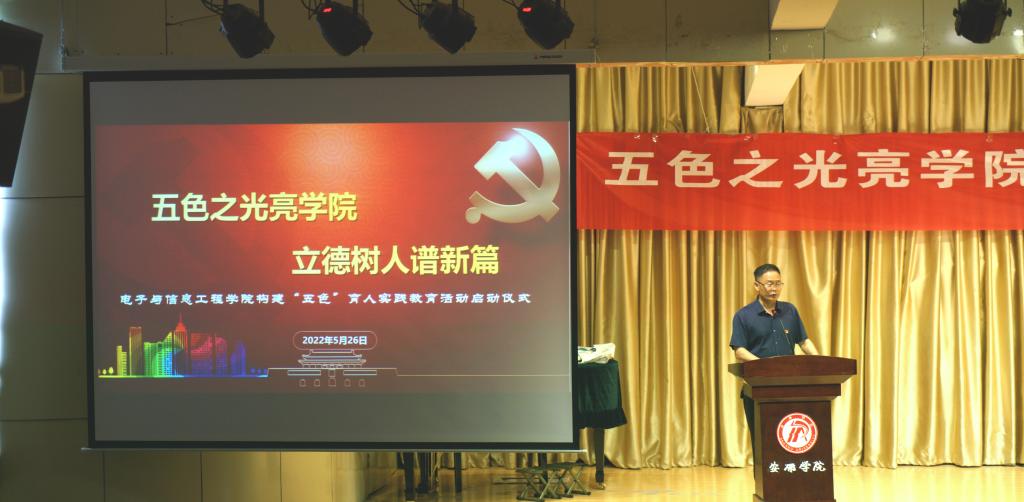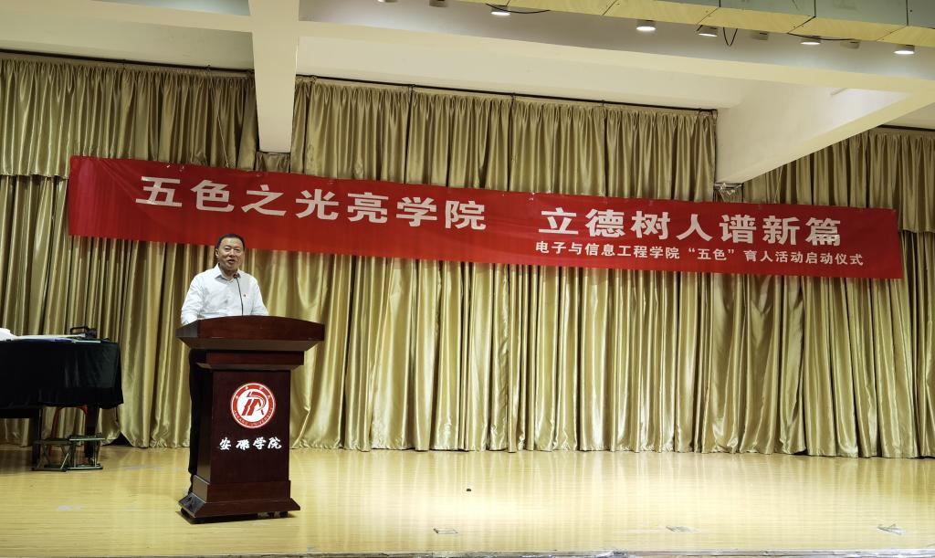 安康学院党委委员、副校长张东红作重要讲话。他肯定了电信学院“五色”育人实践教育活动启动仪式活动形式多样、内涵丰富,以学科专业和第二课堂特色活动展示电信学院青年大学生新风貌、思想政治理论,实践表现,以此看到电信学院对大学生思想政治工作建设的高度重视。张东红表示,电信学院积极探索具有电信学院特色的“五色”育人模式,充分表明了电信学院认真贯彻落实立德树人根本任务、认真贯彻落实三全育人根本要求,认真贯彻落实习近平总书记近期在中国人民大学考察的重要讲话精神,坚持党的领导,传承红色基因,牢记党的教诲,培育立志民族复兴、堪当民族复兴大任的时代新人。就下一步推进“五色”育人工作,张东红提出五点希望:一是以“党旗红”为主色,发挥党旗领航引擎作用。大力推进网络思想政治教育,运用新媒体技术,推动思想政治工作传统优势同信息技术高度融合,使互联网成为开展大学生思想政治教育的新平台。以理想信念教育为重点,将习近平新时代中国特色社会主义思想和对党的路线方针政策的学习贯穿始终,确保社会主义大学的办学方向。二是以“科技蓝”为本色,建设高素质教师队伍。指导学生参加各级各类学科竞赛,增强实践创新技能,营造浓厚的学科竞赛氛围。让蓝色科技之光,照亮电信学子的人生坦途。三是以“榜样金”为特色,助力电信学子砥砺前行。结合专业特色做好志愿服务品牌项目,教育和引导学生提升社会服务意识和实践能力,弘扬志愿精神,传播青春向上的正能量。发挥榜样引领作用,传递青春奋进力量。四是以“活力橙”为亮色,引导学生坚定文化自信。整合先进文化涵养与文明养成教育,大力弘扬伟大建党精神、安康学院精神,讲好党史、团史、校史故事,创新开展校训、校歌、校风的宣传工作,培养既有文化底蕴又讲文明修养的“橙”色青年。五是以“制度黄”为底色,引导学生树立规矩意识。建立健全学院的学风制度,从制度层面帮助学生树立起热爱学习、学会学习、善于学习、坚持学习、全面学习、终身学习的观念。“五色”育人模式,为推进电信学院思政建设提供实践指引。张东红寄语,希望电信学院领导班子进一步细化措施,团结带领全体师生抓好落实,以高质量党建思政引领学院高质量发展,以实际行动和实践成果向建团一百周年和迎接党的二十大胜利召开献礼。