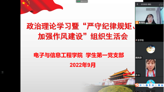 根据《关于在全校开展纪律教育学习宣传月活动的通知》(校党发〔2022〕101 号)文件精神要求,2022年9月6日,电信学院学生第一党支部通过线上腾讯会议召开“严守纪律规矩、加强作风建设”专题组织生活会。会议由学生第一党支部书记程晓梅主持,党总支组织委员成英丽、支委张宇航、辅导员吕以宁、支部全体学生党员参加。