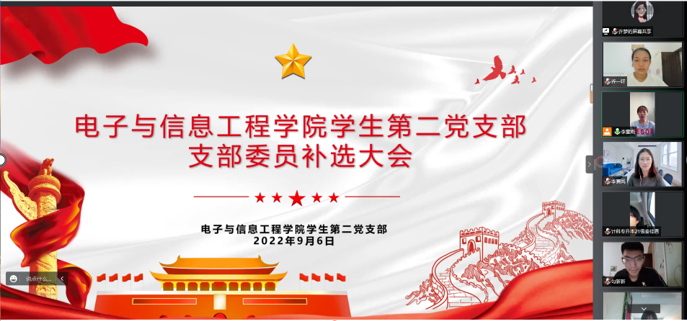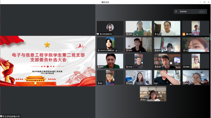 由于学生第二党支部委员会原支部宣传(统战)委员蒋帅已经毕业离校,为确保党支部班子健全、稳定并有序开展工作,根据《中国共产党章程》规定、《中国共产党基层组织选举工作条例》和《中共安康学院委员会二级党组织换届选举工作方案》要求,2022年9月6日,电信学院学生第二党支部通过线上腾讯会议召开支部党员大会,顺利完成支部委员会补选工作,补选出了新的支部委员会宣传(统战)委员。会议由学生第二党支部书记李章雨同志主持召开。