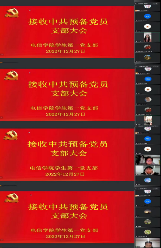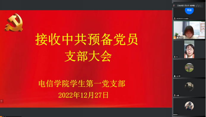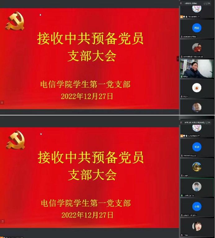12月27日晚上7点,电信学院学生第一党支部采用线上腾讯会议的形式召开了中共预备党员接收大会,会议主要讨论了吴皓阳等9名中共预备党员的转正事宜。电信学院学生第一党支部书记吕以宁,党总支组织(纪检)委员成英丽,支部组织(纪检)委员张宇航,入党培养老师王克刚、成典勤以及支部学生党员和本期发展对象参加了会议。会议由吕以宁主持。