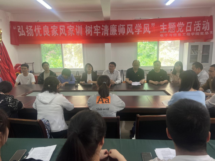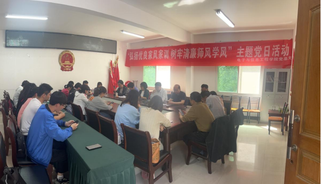 为了深入学习贯彻党的二十大精神,为落实立德树人根本任务营造风清气正的政治生态,在打造清廉学校中积极探索推进优良党风、师风、家风一体化建设,涵养清正校风、教风、学风,构筑新时代清正廉洁的教育高地。4月15日,电信学院党总支开展“弘扬优良家风家训 树牢清廉师风学风”主题党日活动,党委委员、副校长张东红,党总支下设四个党支部所属党员及教职工、部分学生党员参加。电信学院党总支书记于咏梅主持活动。