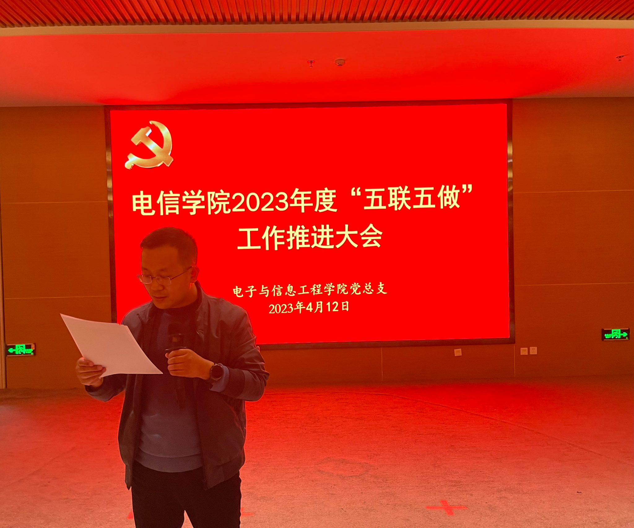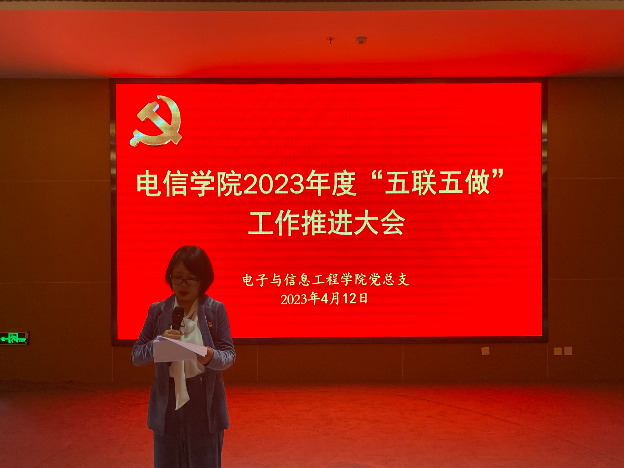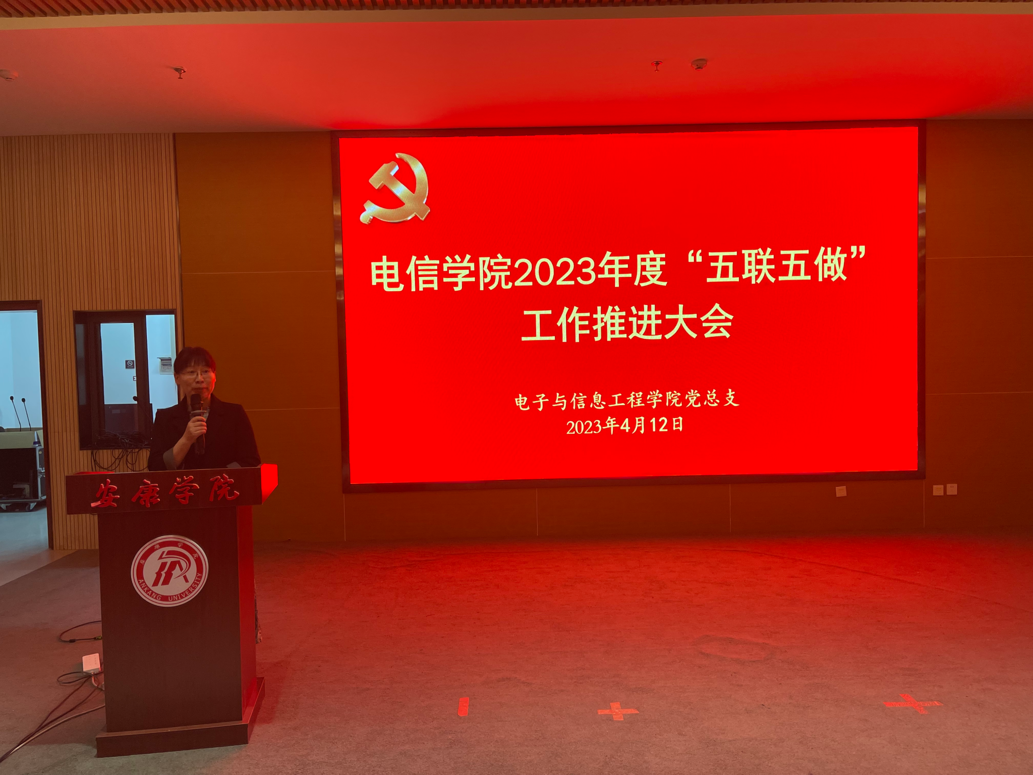 为全面贯彻党的二十大精神,深入推进新时代党的建设新的伟大工程,聚焦“为党育人、为国育才”,紧扣立德树人根本任务,落实标杆党总支建设要求,紧紧围绕学校和学院中心工作,充分发挥院系党组织政治功能,将党建和思想政治工作融入育人全过程,以高质量党建引领学院高质量发展。4月12日下午,电信学院党总支在江北校区图书馆报告厅召开2023年度“五联五做”工作推进会,电信学院全体教职工、学生党员和入党积极分子参加会议。本次会议由党总支书记于咏梅主持。