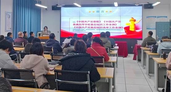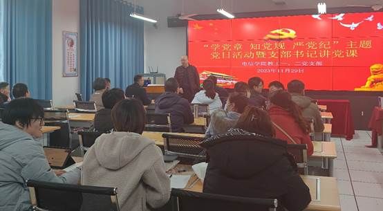 2023年11月29日下午,电信学院教工第一、第二党支部联合开展“学党章 知党规 严党纪”主题党日活动暨支部书记讲党课。电信学院教工第一、第二党支部全体教师党员,学生第一、第二党支部全体学生党员以及部分非教师党员参加活动,会议由教工第一党支部书记赵志强主持。