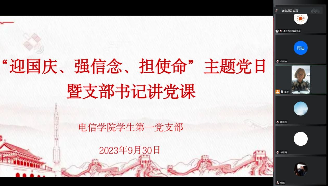为庆祝中华人民共和国成立74周年,激励支部党员听党话、感恩党,跟党走,增强支部成员的凝聚力、战斗力和号召力,2023年9月30日下午19:30,电信学院学生第一党支部通过线上腾讯会议,开展“迎国庆、强信念、担使命”主题党日暨支部书记讲党课。本次活动由学生第一党支部书记吕以宁主持,学生第一党支部全体党员参加。