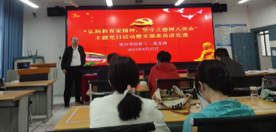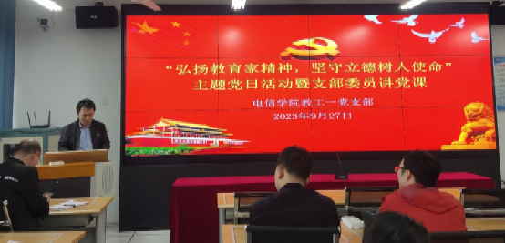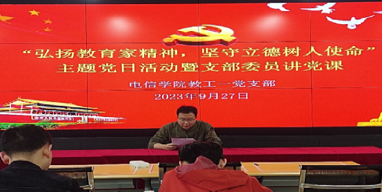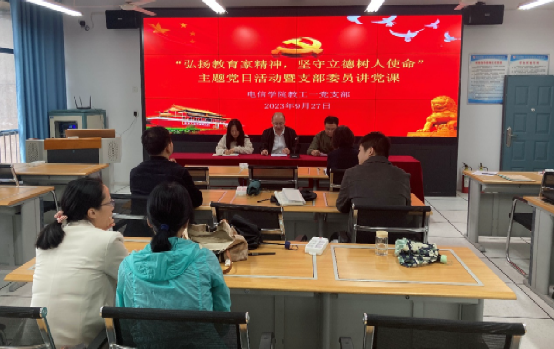 2023年9月27日下午,电信学院教工第一党支部开展“弘扬教育家精神,坚守立德树人使命”主题党日活动暨支部委员讲党课。活动由教工第一党支部书记赵志强主持,支部全体党员参加本次活动。
