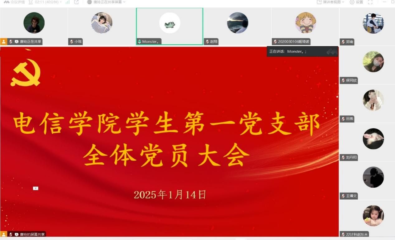 为深入学习贯彻党的二十届三中全会精神和全国教育大会精神,坚定不移推进全面从严治党向纵深发展,增强党员的纪律意识,根据中共安康学院委员会《关于召开2024年度组织生活会和开展民主评议党员工作的通知》的相关要求,电信学院学生第一党支部于1月14日通过线上的形式召开党员大会开展2024年度组织生活会暨民主评议工作。会议由党支部书记翟子轩主持,全体党员参与。