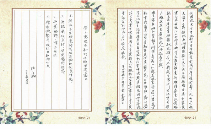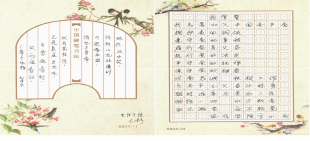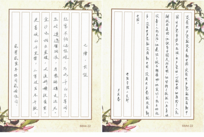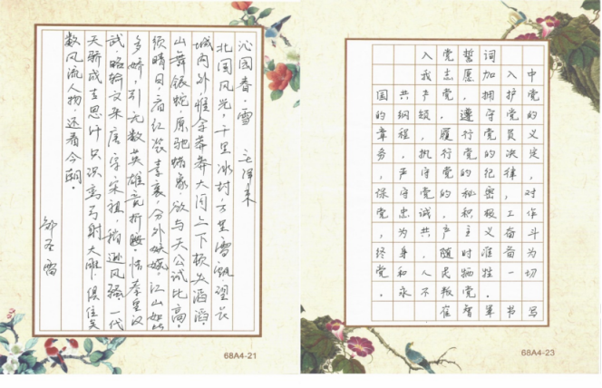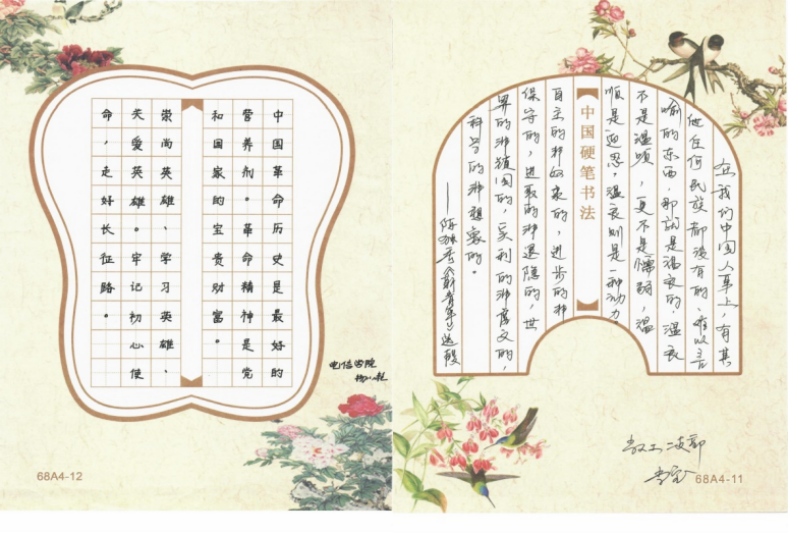 在第二阶段的“学党史硬笔书法展示”活动中,学院体教职工学习党史、手抄党史,积极展示教学基本功。在书写现场,老师们屏息凝神、运笔流畅,把对党的热爱和学习党史的热情融入到一笔一顿中,作品或刚劲有力,或潇洒飘逸,或大方得体,或秀气隽美,展现出电信学院教师扎实的教学基本功和昂扬向上的精神状态。