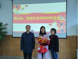 会议最后,由于咏梅为两位老师献花致欢送词,全体教师拍照留念。时代在发展,学院在进步,相信在毛长林、管丽元两位老师职业精神的感召下,我们年轻一代的教师,将继续他们的事业,在自己所热爱的教师岗位上持续发光发热,做“四有好老师”,当好“四个引路人”。同时也衷心的祝愿毛长林、管丽元两位老师心情舒畅,家庭幸福,健康长寿,平安喜乐!也希望两位老师在合理、科学安排好自己退休生活的同时能一如既往的关注电信学院的发展和人才培养,一如既往的为电信学院的发展建言献策。希望我们其它教师继承两位退休教师的优秀传统,坚守育人初心,做好学生的引路人,为党育好人、为国育好才。