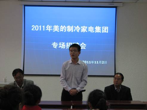 11月2日上午,农生院、中文系、经管系和电信系在1429联合举办了美的集团2011年专场人才招聘会。美的集团制冷部招聘经理沈海,农生院党总支书记屈国胜,电信系党总支书记李红兵,就业处综合管理科科长刘连德,电信系学办副主任石纭昊,经管系辅导员王远银,电信系、经管系、中文系、农生院共60余名同学参加招聘会,会议由李红兵书记主持。