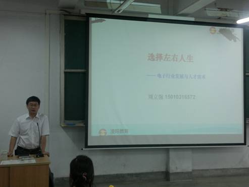 2012年5月22日,电子与信息工程系在1号教学楼1510室举行职业教育报告会,邀请北京凌阳爱普科技有限公司总监刘立强做了“选择左右人生——电子行业发展与人才需求”主题报告会。电信系副主任陈守满,辅导员成英丽以及2013届电子信息工程专业90余名学生参加会议。