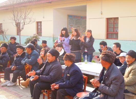 大家一踏进敬老院就迎来了老人们和蔼的笑脸,在带队老师的安排下,打扫、整理屋子井然有序进行着,收拾完毕,同学们有的陪老人聊天回忆美好的往事,有的为敬老院的老人们表演节目、开联欢。