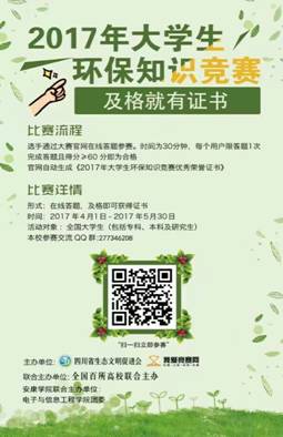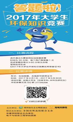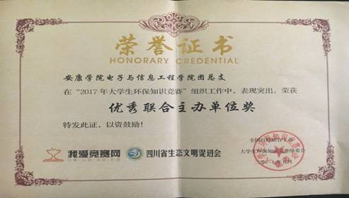 2017年6月电信学院团总支为传播环保文化,普及环保理念,提高我校大学生的环保意识,保护美化生态环境,特联合四川省生态文明促进会和我爱竞赛网共同成立的大学生环保知识竞赛组委会,举行安康学院“弘扬环保文化,建设绿色校园”的环保知识竞赛。
