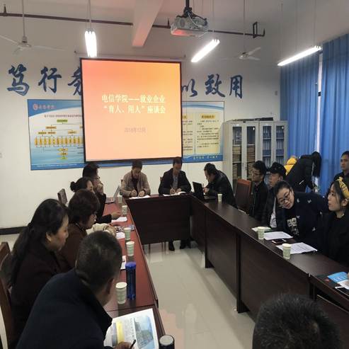 12月1日下午,电信学院在科技楼B702室召开就业企业——“育人、用人”座谈会。360安全集团, 北京优炫股份有限公司, 陕西巨人商务信息咨询有限公司, 上海傲梦网络科技有限公司, 四川链家房地产经纪有限公司, 西安达内优创信息科技有限公司, 西安云间信息科技有限公司, 陕西凤凰国际飞行学院, 安康铭天科技有限公司,电信学院院长陈守满,副院长王庆春,两办主任,系主任出席会议。会议由党总支书记何道利主持。