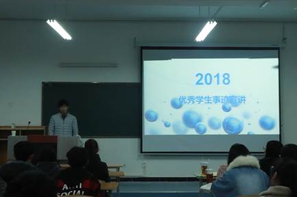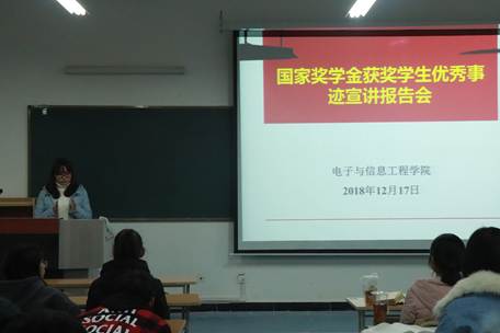 2018年12月17日晚7点30分,电信学院进行了国家奖学金获奖学生优秀事迹进班宣讲报告会,报告会由团总支书记陈浩老师主持,电信学院2018年荣获国家奖学金的王松、汪钊、黎敏三位同学作报告,电信学院全体大一新生参加。