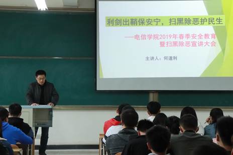 2019年3月22日下午4点,欧美日韩国产在线团总支于1305教室开展了2019年春季安全教育暨扫黑除恶宣讲活动。参加此次活动的有电信学院党总支书记何道利、团总支书记陈浩以及电信学院全体学生干部。