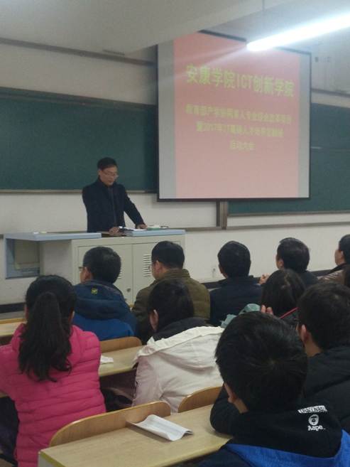 2017年11月29日下午,安康学院ICT创新学院暨2017年IT高端人才培养定制班启动仪式在1305教室举行。会议由电信学院副院长陈守满主持。党总支书记何道利、各系主任及15级全体学生参加。