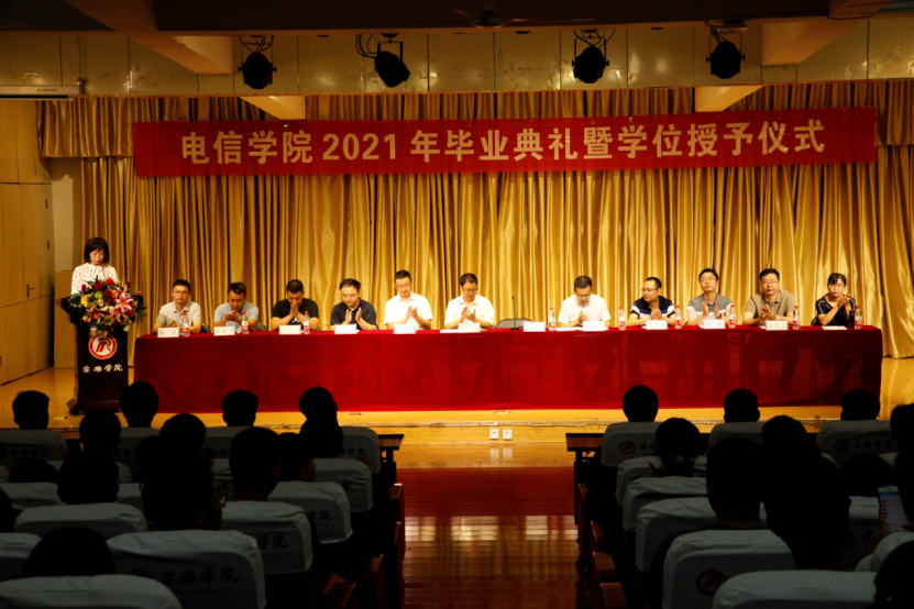 典礼在庄严的《中华人民共和国国歌》声中拉开了帷幕。电信学院院长陈守满教授代表学校和全体教职工向圆满完成学业、获得学士学位的同学表示热烈祝贺!向为同学们成才成长倾注了心血汗水的老师与家长致以崇高的敬意!他在致辞指出这届毕业生在安康学院的4年求学岁月,与党和国家继往开来的关键节点,与学校追赶超越的重要时刻,相互交叠、互促共荣。大家见证了党的十九大胜利召开,沐浴着改革开放40周年的浩荡春风,共襄新中国成立70周年的恢弘盛典,见证绘就决战决胜脱贫攻坚的“收官答卷”,共同经历全国抗击新冠肺炎疫情斗争取得重大战略成果。历史将永远铭记这不同凡响的峥嵘岁月,将永远照耀这来之不易的辉煌荣光。同时,陈院长也对即将毕业的青年学子提出了三点希望:一是“修德”,希望大家始终做与党和国家同向同行、共同前进的时代新人,心怀“国之大者”;二是“修身”,要求大家能观大局、察大势、立大志、明大德、成大才、担大任;三是“修业”,需要大家在“只争朝夕”的大时代中,做有本领的时代新人,做“顶天立地”的大文章。