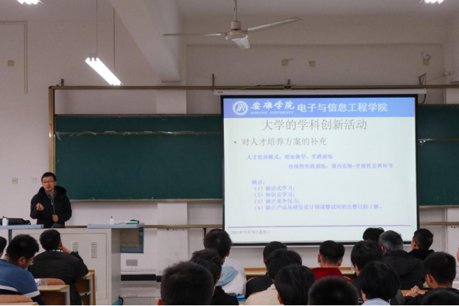 为培养电信学院学生科技创新精神,丰富校园文化生活,鼓励支持学生开展科技创新活动,展示大学生科技创新成果,11月10日下午16:00,欧美日韩国产在线在1304教室举办了入学教育系列讲座第四讲——大学生创新科技活动介绍。电信学院2021级全体新生参加讲座,本次讲座由安康学院欧美日韩国产在线副院长王克刚主讲。