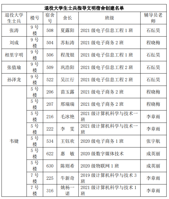 电信学院退役大学生士兵指导文明宿舍创建名单