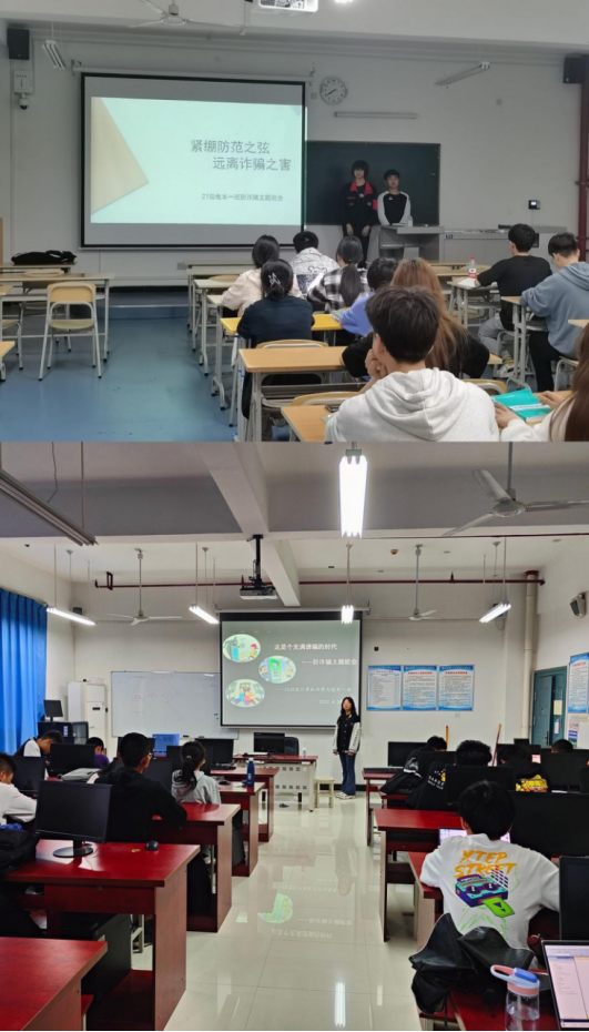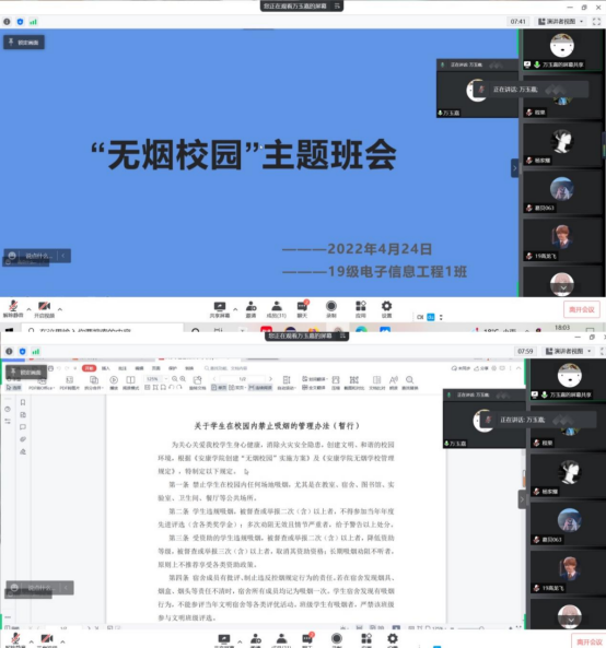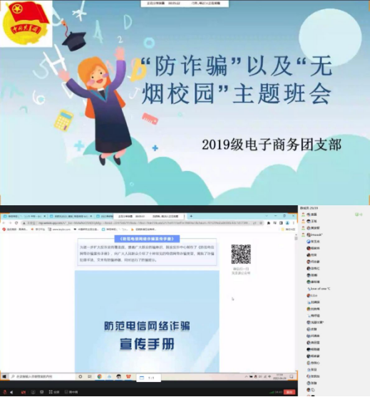 为了提高学生防范网络诈骗的意识与能力,为了引导学生远离烟草、拒绝烟草,积极营造健康、安全、文明的校园环境,4月24日电信学院各班组织学生召开以“谨防网络诈骗”与“无烟校园”为主题的班会。