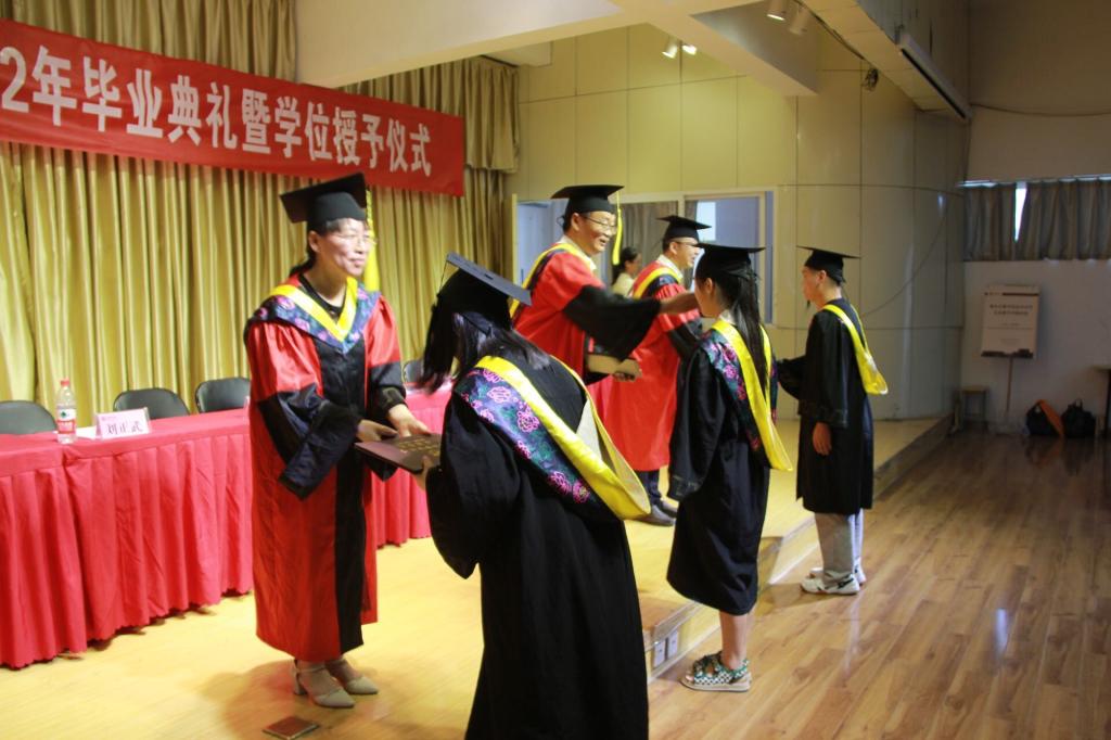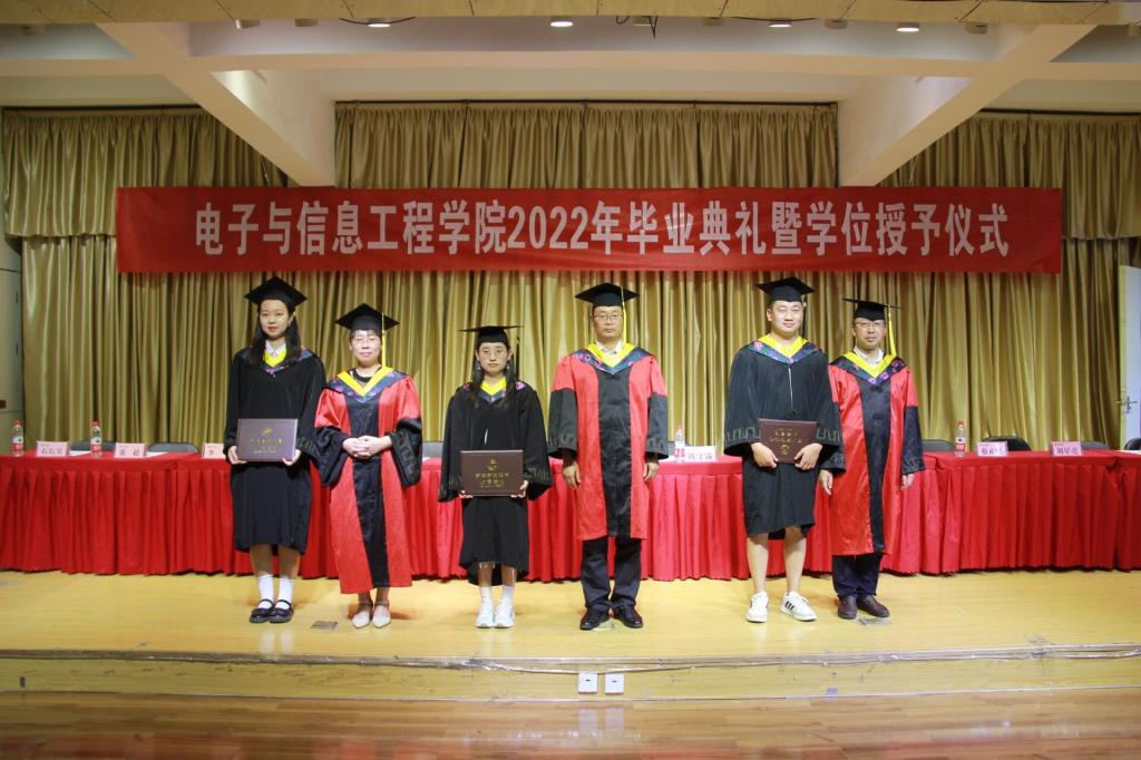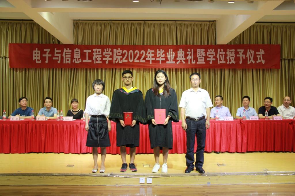 在全场的掌声下,2022届获得学士学位毕业生依次上台,由院长陈守满、副院长王克刚、教师杨亦云为学生拨流苏、理绶带、正衣冠,颁发学士学位证书,一起合影留念。