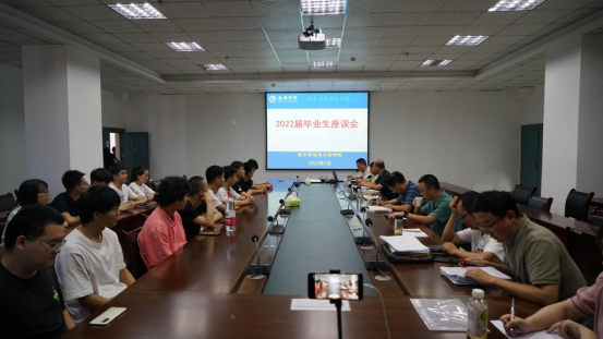 在2022届毕业生离校之际,为做好毕业生离校教育工作,同时听取学生对学校学院发展建设的意见建议,共同探讨学院未来的发展,推动人才培养工作高质量发展,2022年7月6日电信学院在逸夫科技楼9楼会议室召开2022届毕业生座谈会。电信学院党总支书记于咏梅,院长陈守满,副院长王克刚、宋权华、党总支副书记蔡正旺、学工办主任石纭昊、各系主任、毕业班辅导员及2022届毕业生代表参加会议,会议由石纭昊主持。
