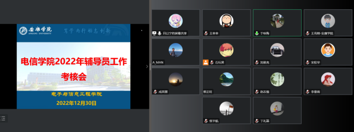 为切实加强辅导员队伍建设,发挥先进典型的引领和示范作用,更好地调动和激励电信学院辅导员工作积极性和创造性,认真履行立德树人的崇高使命,促进辅导员专业化、职业化发展,12月30日上午,电信学院召开了2022年辅导员工作考核会。电信学院辅导员考核工作小组成员及全体辅导员参加此次会议。本次会议由党总支书记于咏梅主持。