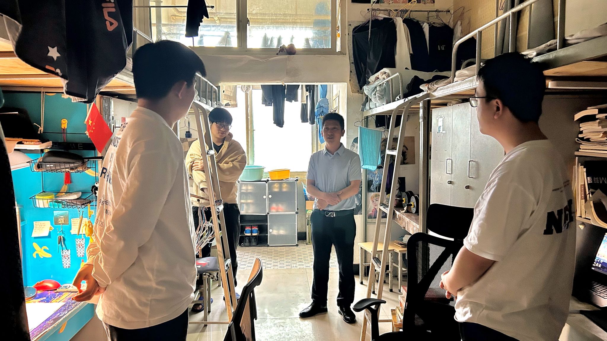 在检查过程中,学院领导及辅导员们还与学生进行了亲切交流,了解了他们的生活和学习情况,鼓励学生在课余时间走出宿舍参与体育活动。并提醒学生们要增强安全意识,在日常生活中关好门窗,进出宿舍拔掉钥匙,同时加强学校用电安全、消防安全等方面的知识,确保自身安全。