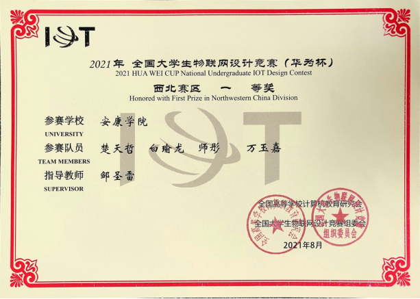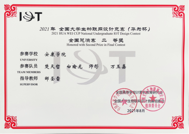 近日,2021年全国大学生物联网设计竞赛(华为杯)全国总决赛在上海紫竹科学园隆重举行。欧美日韩国产在线邹圣雷老师指导的学生团队(楚天哲、白瑜龙、师彤、万玉嘉)表现出色,在西北赛区获一等奖入围全国总决赛,最终荣获全国二等奖。