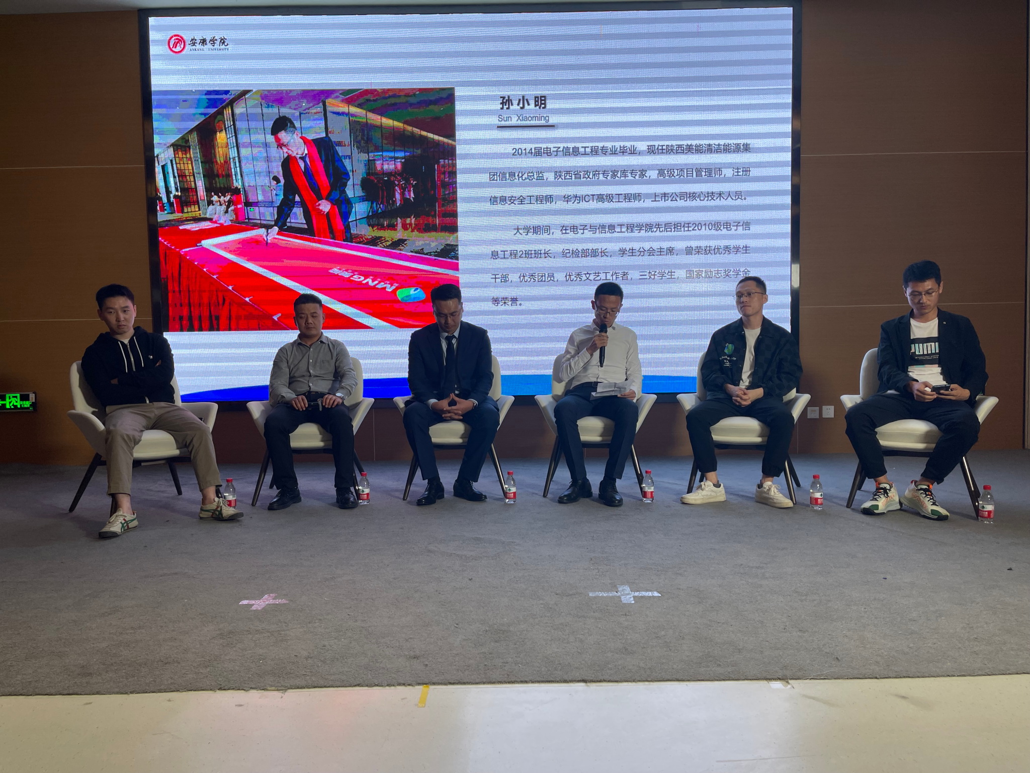 接着,于咏梅介绍六位校友基本情况并致辞,她讲到母校与校友是情感的共同体。母校与校友有着最天然、最本真的情感联结,有着最深沉、最厚重的情感交织。母校与校友是发展的共同体。母校和校友一路彼此扶持,彼此成就。校友们在校期间,母校教给大家知识与学问,塑造你们的精神与品格。校友离开学校走向更广阔的天地后,母校仍然是校友永不枯竭的精神动力和终身发展的现实支撑。而校友们则成为母校的延伸和象征,以在各行各业的成就为母校增光,以各种方式回报支持母校,成为母校事业发展的中坚力量。随后各届校友分别分享毕业后的就职经历和自己在就业中得到的感悟,并结合实际为同学们提出建议。2014届电子信息工程专业孙小明通过介绍学习和工作经验、结合国际形势和行业发展方向,为同学们择业就业提供参考,希望同学们能够认清形势,找准定位,提前规划;2014届电子信息工程专业吉明超从“坚定信念”、“持续奋斗”和“终身学习”三方面给同学们展开分享,并告诉同学们无论将来从事什么样的工作,一定心存“志存高远,便力量无穷”的信念。2014届电子信息工程专业寇强分享自己的工作专业领域发展,并向同学们介绍前沿技术以及在大学中应该学习哪些方面的专业技能。2014届电子信息工程专业净晓刚通过讲述自己在专业领域一路奋斗的历程,鼓励同学们勇担时代重任,以时不我待的紧迫感,舍我其谁的责任感,积极投身民族复兴的伟大事业,用智慧和汗水拼出一个美好未来。2013届电子信息工程专业许赢政,介绍自己创业经历,并回顾上学时印象深刻的温馨故事。2016届数字媒体技术专业姬一波鼓励电信学院的学生肩负起实现科技“跟跑,并跑到领跑”的责任使命,鼓励同学们练就终身学习的本领,守正创新、开拓进取,努力为国家电子信息产业高质量发展贡献力量和智慧。