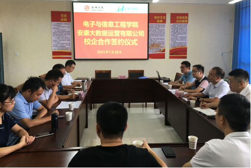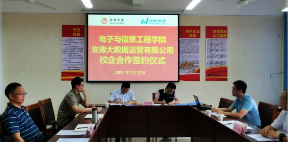 7月22日上午,安康学院欧美日韩国产在线与安康大数据运营有限公司在江北校区逸夫科技楼B702成功举行校企合作签约仪式。安康大数据运营有限公司总经理彭永辉、副总经理王毅立、梁铭及公司各部门负责人、电信学院院长陈守满、副院长王克刚、宋权华、大数据与智能信息处理中心主任余顺园、计算机专业相关教师出席本次仪式。签约仪式由电信学院副院长宋权华主持。