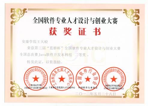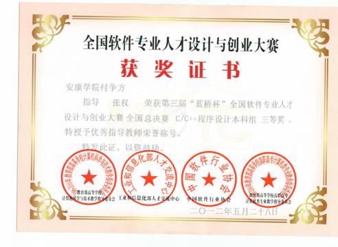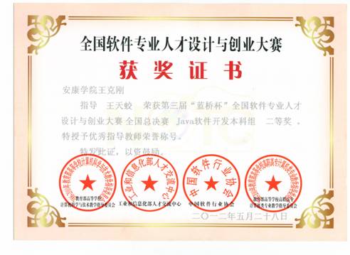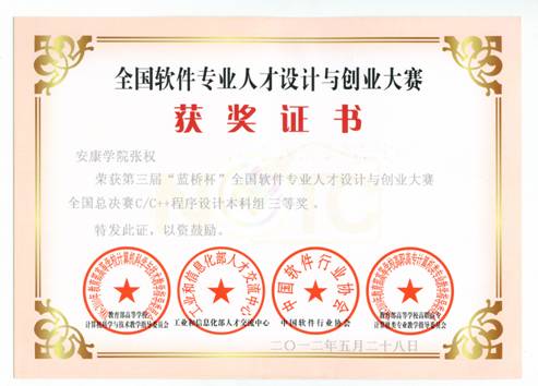 524527,获得陕西赛区一等奖的计算机科学与技术专业09级(1)班王天蛟、张权同学参加了在北京航空航天大学举行的全国总决赛,王天蛟同学获JAVA本科组全国二等奖,张权同学获C/C++本科组全国三等奖。