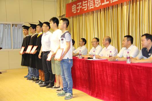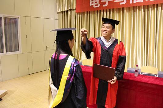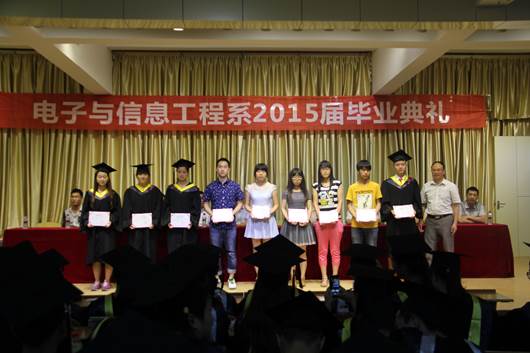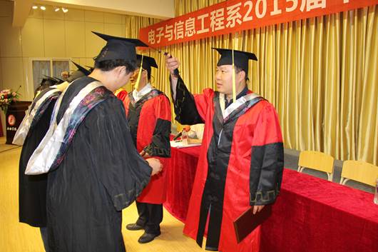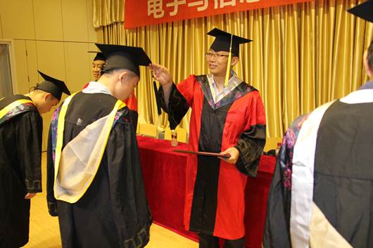 在悠扬的毕业歌中,副校长杨行玉教授、电信系主任张东红教授、电信系陈守满教授、王庆春副教授、付争方副教授为毕业生一一授予了学士学位证书。