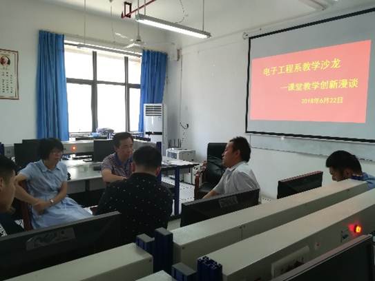 为了巩固教学中心地位,提高课堂教学质量,更好领会教育部“新时代全国高等学校本科教育工作会议”的精神,2018年6月22日,电信学院电子工程系在逸夫科技楼B401实验室以“课堂教学创新”为主体开展了教学沙龙活动。学校教学督导梁俊龙、电信学院副院长王庆春和电子工程系全体教师和电子信息工程专业2017级和2016级的部分学生代表参加了教学沙龙活动。