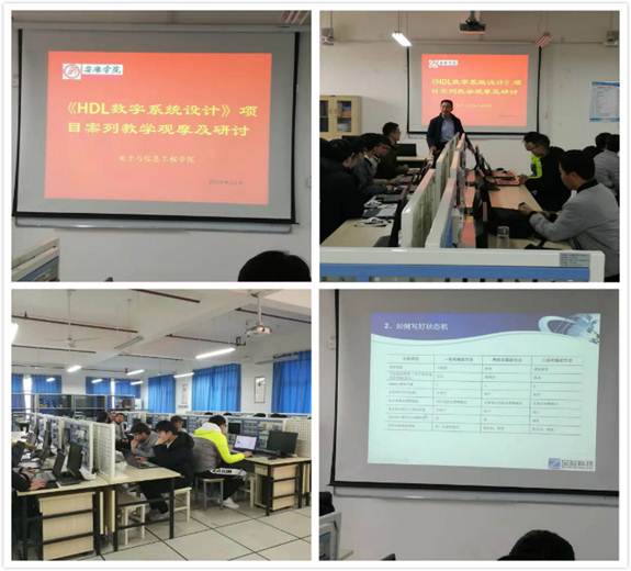 为了进一步推进课堂教学改革,增强课堂教学效果,不断提高应用型人才培养质量。2019年11月15日,电信学院特邀产学合作协同育人企业至芯科技公司贺磊工程师,在江北校区逸夫科技楼B601实验室以学校首批立项的“双师课程”《HDL数字系统设计》为例,进行了一次项目案例教学公开示范观摩课。电信学院院长陈守满、教学副院长王庆春、无课教师以及电子信息工程专业2017级部分学生参加了本次活动。