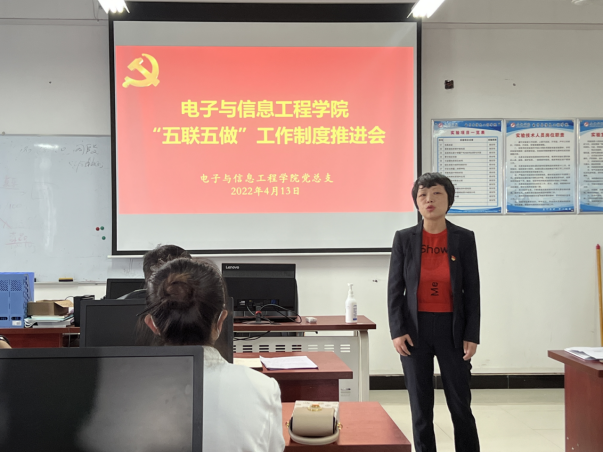 为积极引导基层党组织、党员干部、师生党员等融入“三全”育人工作,建立党建引领、结对共建、师生同行的基层党建工作育人新机制,增强党员干部责任意识、问题意识和服务意识,4月13日,电信学院召开“五联五做”工作制度推进会。电信学院全体教师及学生代表参加会议。本次会议由电信学院党总支书记于咏梅主持。